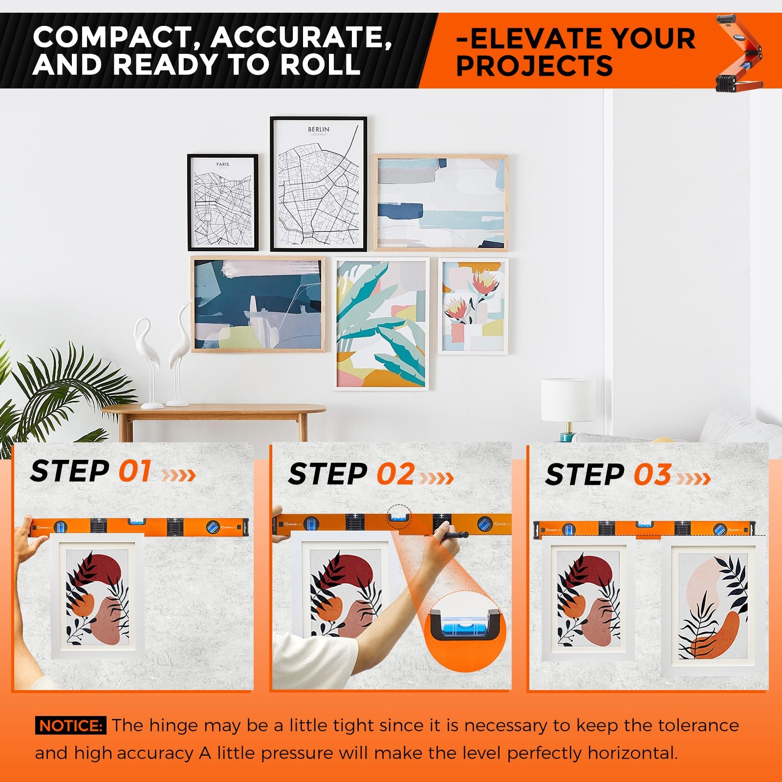 • Portable and Easy to Store:Thanks to its three-section foldable design, this level is highly portable and easy to store. It effortlessly fits into your toolbox or can be carried with you, ready for measurements wherever you go.
